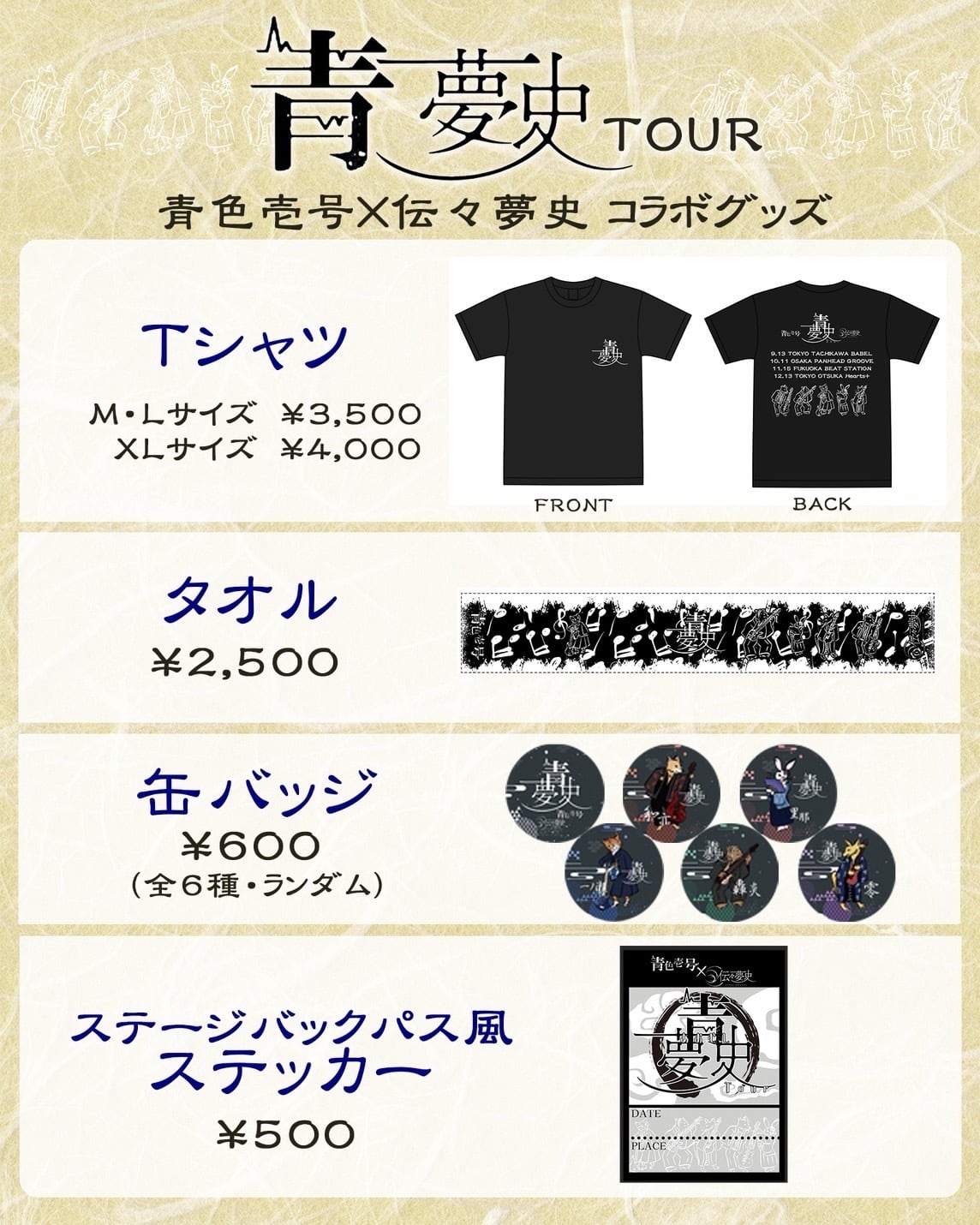2025年9月〜2025年12月に行われた、青色壱号と伝々夢史のカップリングツアー青夢史Tour記念ステッカー。メンバーが鳥獣戯画風にデザインされた、可愛いサテンシールです。